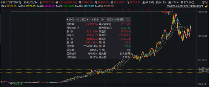 基恩士股价从2008年低位到2021年高位涨幅近26倍。