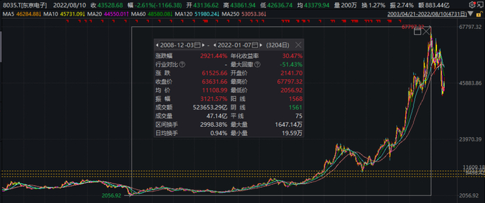 东京电子股价从2008年低位到2022年高位,涨幅近30倍。