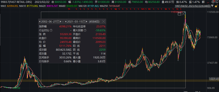 迅销集团股价从2002年触底就一路走上行趋势,到2021年涨幅超过40倍。