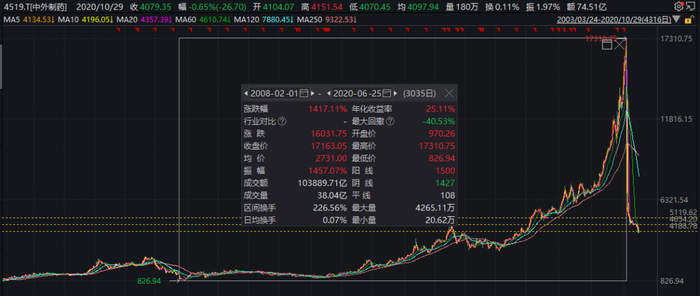 中外制药从2008年的低位涨到2020的高位,涨幅超过14倍。