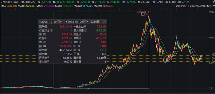 Seria是其中的十倍股或者说是百倍股。股价从2008年最低的36日元涨到2018年最高的6914日元,涨幅远超百倍。
