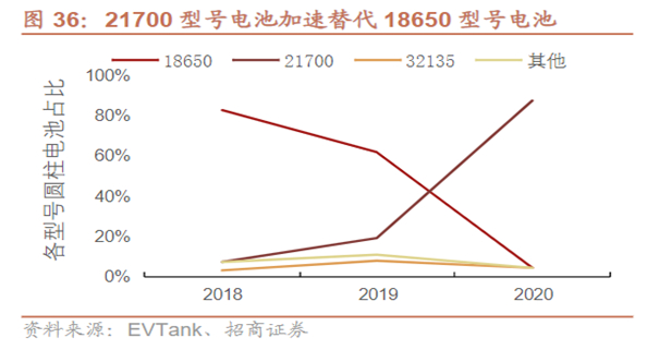 创新不息,降本不止,2017年,特斯拉开始将其电池由18650切换至21700,率先应用于新车型M3中(后来的爆款车型)。21700相较于18650在单电芯和系统方面性能均有明显提高,在 2019-2020年也是迅速取代18650成为占比最高的圆柱电池。【注:18650中18指圆柱直径,65指高度,0指圆柱;21700、4680类同】