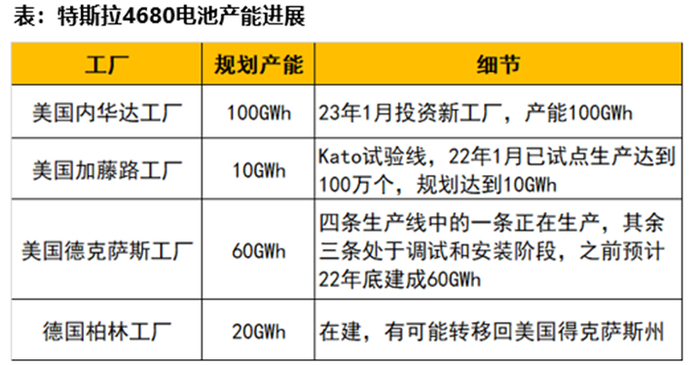 特斯拉2020年9月提出4680,彼时目标是2022年实现年产能100GWh,如今两年多过去,从后视镜看,4680实际量产情况是不及预期的。虽迟但到,2023年46大圆柱将真正迎来放量元年:特斯拉22年底加州工厂产线周产能已爬坡至86.8万颗,能配套1000辆Model Y,对应年产能约4GWh;此外,特斯拉也表示4680已经熬过了量产的最困难时期,并拟在内华达州扩产100GWh的4680年产能。