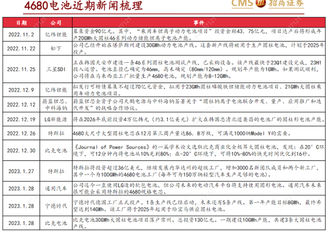 ·蔚来汽车:23年2月,据消息人士称蔚来计划在合肥新建电池工厂,规划产能40GWh,将投产自研的46系列大圆柱电池。