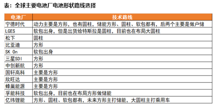 正是基于三种封装形式的各自性能差异,电池厂(包括整车厂)都有自己的路线选择,以电池厂为例:像国内的宁德、比亚迪、中航等主要是方形;亿纬方形、圆柱都有布局;孚能主打软包。国外的LG软包出身,目前也重点布局了圆柱;松下主打圆柱;三星SDI主要是方形。