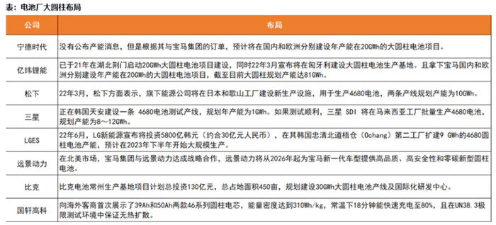 ·国内外主流企业均在布局。国内有宁德、亿纬、远景动力、比克、国轩;国外有LG、松下、三星SDI等多家头部电池企业均已经规划布局、扩产46大圆柱。
