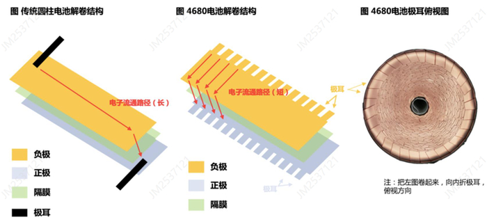 全极耳→降低内阻、减小发热、提高快充速度。 传统锂电池多单极耳,4680创新性提出全极耳,全极耳明显缩短电子流通路径(传统800-1000mm,4680只有80mm),进而降低内阻(传统>20mΩ,4680为2mΩ),降低发热量(传统上升60度,4680最多上升20度),能够适用更大电流快充;同时全极耳下电池内部温度分布更加均匀,热稳定性更好。