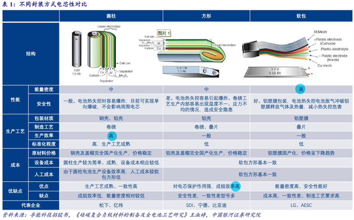 2) 圆柱电池:最大的优势就是生产效率最高(主流型号每分钟在200左右,方形10-20,软包更低)、一致性高;相对劣势是成组效率比方形低、能量密度比软包低。
