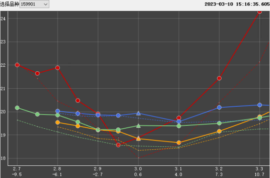 创业板ETF期权方面,上周3月隐含波动率收于20.44%,4月隐含波动率收于20.65%,6月隐含波动率收于21.44%,9月隐含波动率收于22.15%。前一周3月隐含波动率收于21.01%,4月隐含波动率收于20.82%,6月隐含波动率收于21.76%,9月隐含波动率收于22.29%。上周实际波动率为15.60%。隐含波动率高于实际波动率。