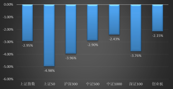 截止10日收盘,上证50收2636.39,周涨跌幅-4.98%,沪深300收3967.14,周涨跌幅-3.96%,中证500收6204.90,周涨跌幅-2.90%。科创50收993.55,周涨跌幅-0.54%,创业板指收2370.36,周涨跌幅-2.15%。