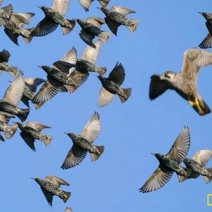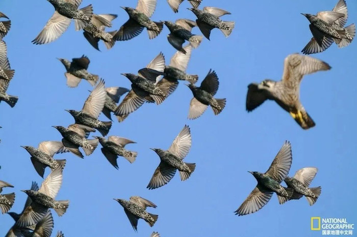 椋鸟也是候鸟,它们的迁徙活动非常准时,迁徙时间可能不完全取决于温度的高低,而是取决于天文原因。椋鸟早出晚归。而晚归的椋鸟会汇集成一个个由数千只椋鸟组成的鸟阵。游隼经常在鸟群附近出没。它们是椋鸟的天敌。然而,游隼并不会进入椋鸟阵中。如果一只游隼在飞行中与一只椋鸟相撞,那么游隼脆弱的翅膀可能会断裂,造成致命的事故。因此,游隼只能伺机捕捉边缘落单的家伙。面对游隼的袭击,椋鸟做出的反应是彼此靠近,收拢队伍。它们最引人注目的队形变化正是为了对付游隼的反复攻击。