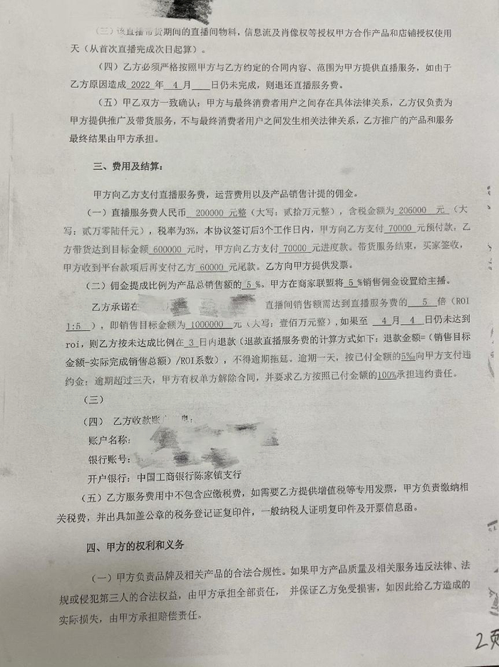 去年1月9日,两家公司签订了合同,由曹某某直播带货,南宁某商贸公司支付20万元直播服务费,在2022年4月30日之前,曹某某在直播间销售额要达到100万元;如果未达到,上海某网络公司要退还直播服务费,并支付已付金额100%的违约金。