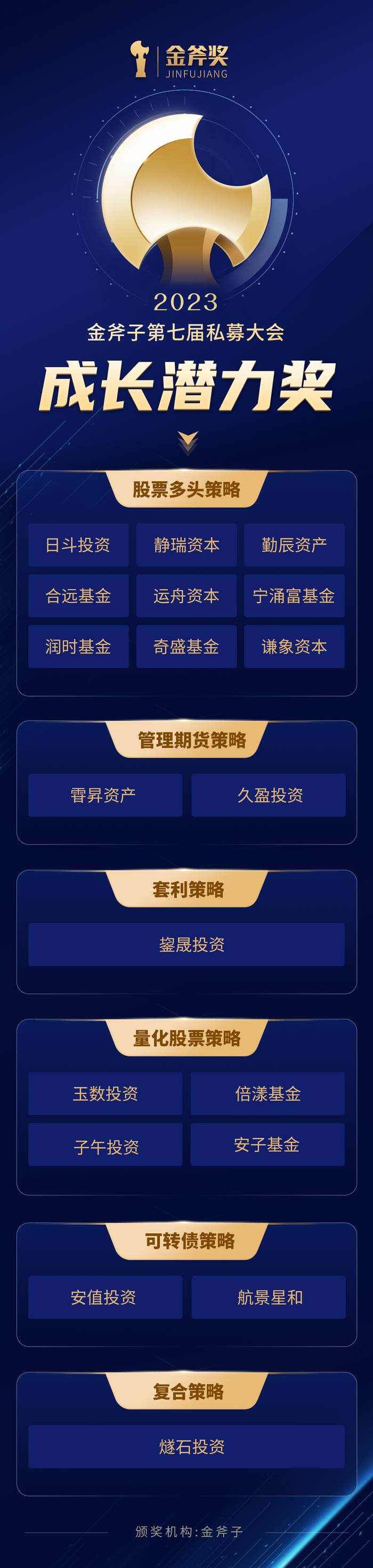 金斧子在近年来的基金评估当中,除了一直聚焦老牌私募机构、明星基金经理、市场老兵外,还持续跟踪研究具有未来爆发潜力的“黑马型”基金或者成长空间巨大的基金经理。本届金斧奖中,日斗投资、静瑞资本、勤辰资产、久盈投资、鋆晟投资、燧石投资、运舟资本等机构荣获2022年“成长潜力奖”。