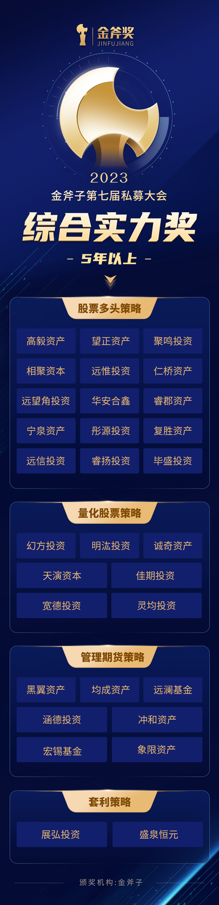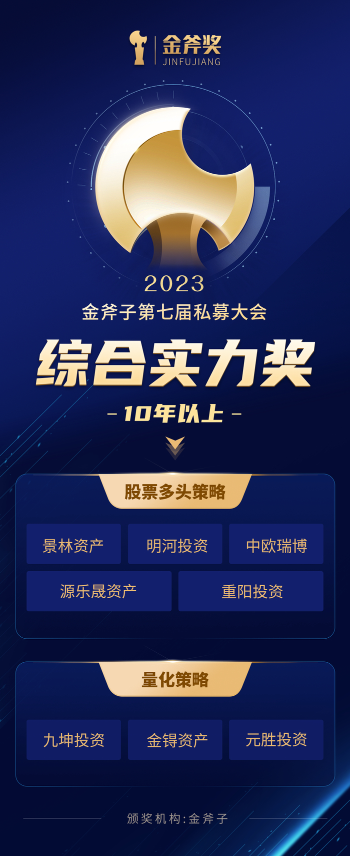 根据金斧子投研中心搭建的阳光私募基金评估体系为基础,从私募机构是否合规、是否能为投资者提供长期、稳健、持续的业绩回报等多个方面进行综合考察,从中筛选出在长期维度里(10年、5年、3年)表现优异的机构颁发综合实力奖。