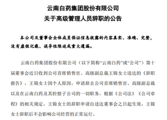据中新经纬报道,3月15日晚间,云南白药公告称,首席销售官、高级副总裁王锦申请辞去在公司一切职务;此前在3月6日,担任云南白药董事长近20年的王明辉,也突然宣布辞去一切职务。而云南白药对外透露,二人均是个人原因。