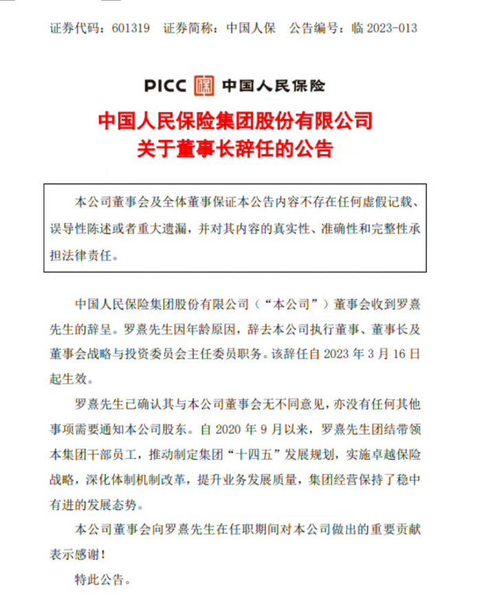 中国人保3月17日晚间公告,罗熹因年龄原因,辞去公司执行董事、董事长及董事会战略与投资委员会主任委员职务。