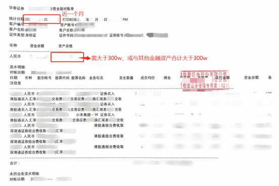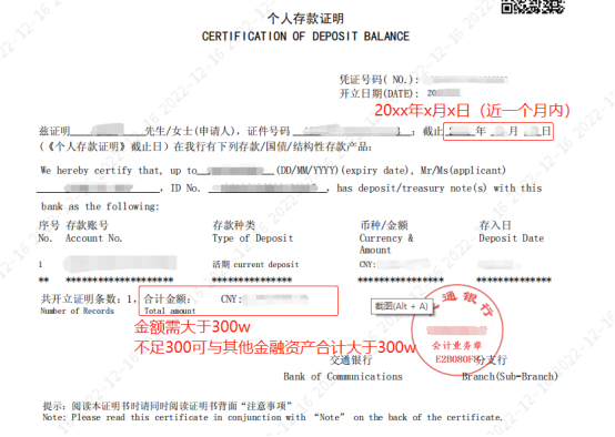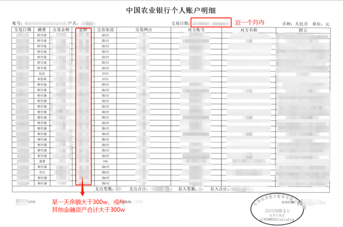 (提交材料前一个月某天的账户余额大于300万,或和其它金融资产合并大于300万即可)