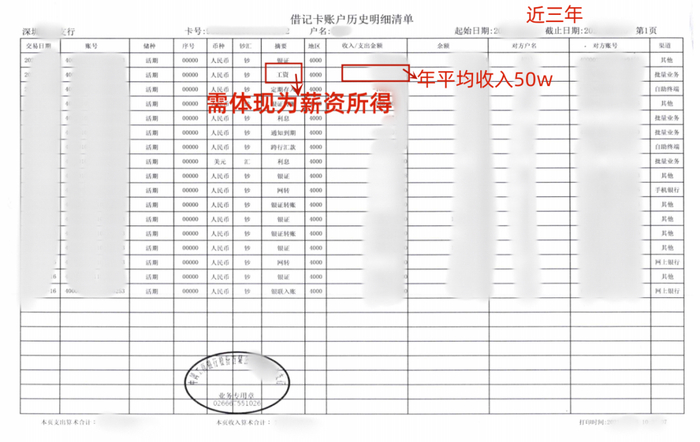 银行出具的代发工资银行卡(活期存折)入账单,示例如下(要求开具材料的时间往前三年,且必须体现是薪资所得):