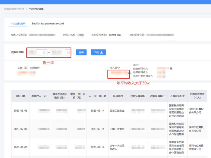 税务部门出具的个人所得税纳税证明,可登录自然人电子税务局官网通过身份验证申请开具,示例如下(要求开具提交材料时点往前三年):