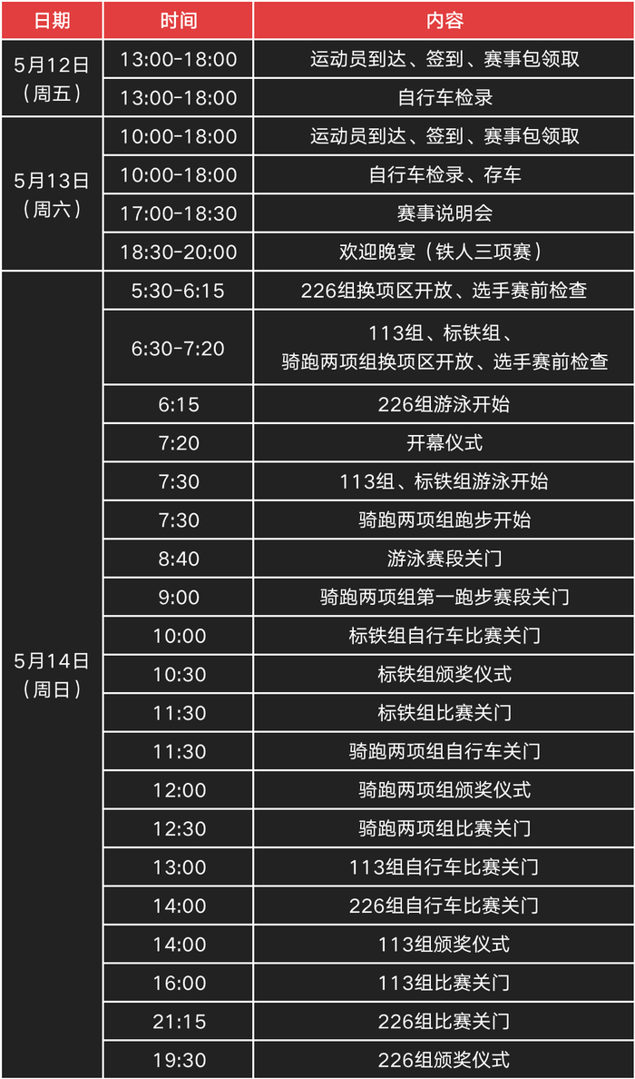 2. 226、113、奥运标准距离组、骑跑两项组取年龄组男女前三名进行颁奖,113、奥运标准距离接力组取总成绩前三名进行颁奖。