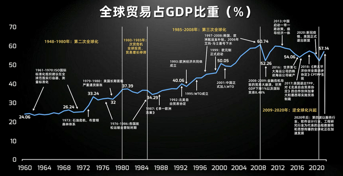 1945年,二战结束之后,世界迎来了全球贸易快速增长的时代。下图展示了1960年以来,以全球贸易占GDP比重来衡量的全球化程度。蓝色曲线上升,代表贸易增速快于GDP增速,全球化程度加深;曲线下降,代表贸易增速低于GDP增速,全球化退潮,也就是所谓的“逆全球化”。