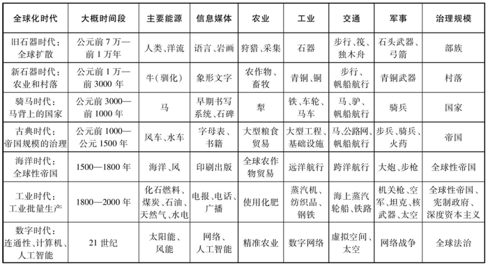 下表总结了这七个时代,以及它们的时间间隔、主要技术变化和治理规模。