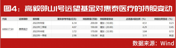 4 月 7 日,惠泰医疗发布 2022 年年报,四季度末的前十大流通股股东名单中,由冯柳管理的高毅邻山 1 号远望基金位居第二位,季度末持股 200 万股,较上一报告期继续增持了 10 万股。且结合历史数据来看,冯柳自 2022 年一季度首次现身公司大股东阵营以来,持续对公司进行了增持操作(见图 4)。
