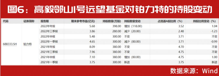 3 月 31 日,涉及航天军工、卫星导航、新材料等概念的铂力特发布年报,高毅邻山 1 号远望基金同样继续于公司大股东名单现身,季度末持股 398 万股,相较 2022 年三季度末增持了 118 万股,而基于此,冯柳的持股排名也由三季度末的第五大股东跃升为第四大股东。且自 2021 一季度介入以来,冯柳在 2022 年四季度对铂力特的持仓达到了历史最高位(见图 6)。