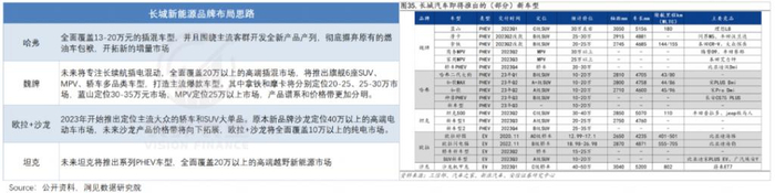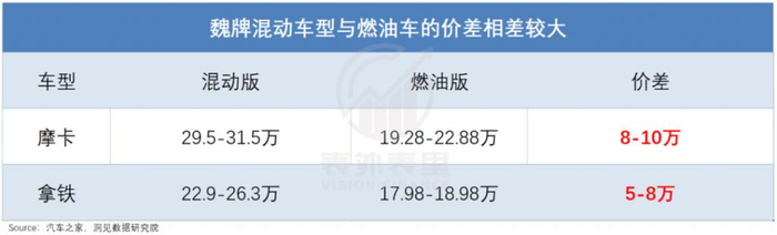 可以看到,其率先将 PHEV 技术搭载至定位中高端的魏牌车型,且定价显著高于同款燃油车。