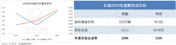 新品周期带动下,在行业销量仍然同比下滑的 2020 年,长城量利齐升,率先走出低谷,超额完成了 2020 年的股权激励目标。