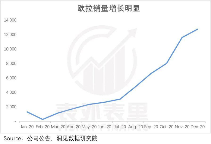价格区间在 20 万以上的越野车型坦克 300,从 2020 年 11 月预售开始,月订单量一路走高。由于太过火爆,在 " 闲鱼 " 上,甚至出现倒卖订单的 " 黄牛 "。