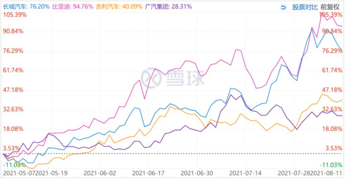 燃油车板块,新车周期仍在延续;新能源领域也坐上风口。双重驱动下,2021 年这一波行情中,长城的上涨幅度仅次于比亚迪。