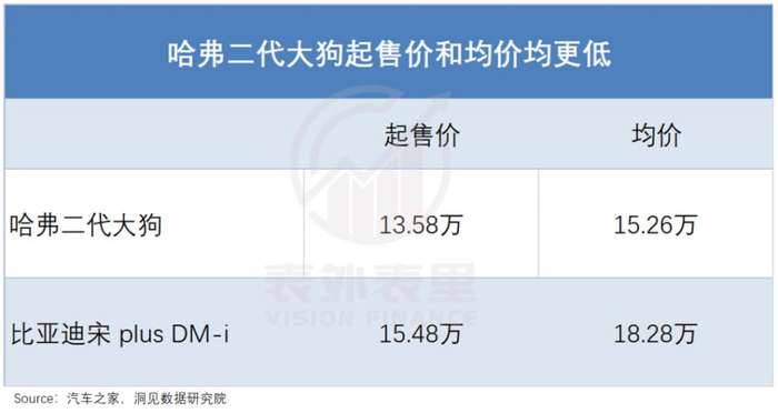 以今年上市的哈弗二代大狗 PHEV 为例,对标的正是终结了哈弗 H6 连续 101 个月销量冠军的比亚迪宋 PLUS DM-i,且无论是起售价和均价都更便宜。