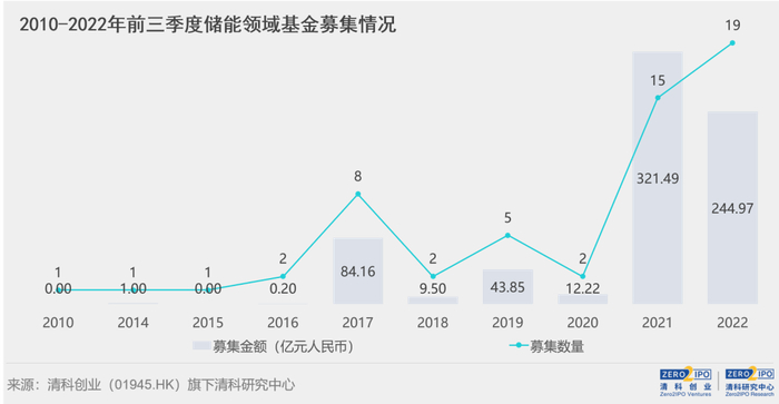 根据清科研究中心不完全统计,截至2022年第三季度,中国股权投资市场中共有接近60支基金将储能作为主要投资或关注领域,累计募集资金717.39亿元。从时间分布来看,2017年和2021年的募集数量和金额均出现大幅增长,且多数大额基金出现在2021年及之后,这与国家制定的“由示范应用向商业化初期阶段过渡”,以及“由商业化初期向规模化发展转变”的产业发展规划时间节点大体重合,反映出国家政策对于储能产业的引导性作用。