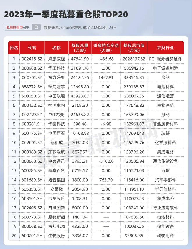 私募重仓股TOP20曝光!冯柳重仓海康威视大赚35亿!