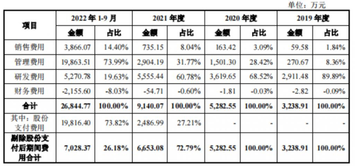 2021 年及 2022 年 1-9 月,键嘉医疗产生的股份支付费用为 2486.99 万元、1.98 亿元,计入当期损益。同期,公司计入管理费用的股份支付费用为 496.48 万元及 1.7 亿元,占管理费用比例分别为 17.1%、85.6%;计入研发费用的股份支付费用为 1990.52 万元及 1611.65 万元,占研发费用比例分别为 35.83%、30.58%。