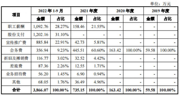 具体来看,公司销售费用主要包括职工薪酬、宣传推广费及会务费,三项各期合计占比分别为 100%、100%、87.97% 和 60.41%。