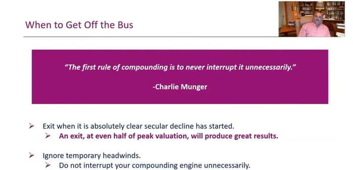 我喜欢查理的这句话:“复利的第一条规则是永远不要不必要地提前中断它。”所以不要退出,直到它绝对清楚地表明已经开始长期衰退。