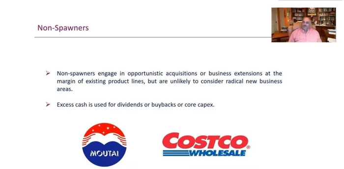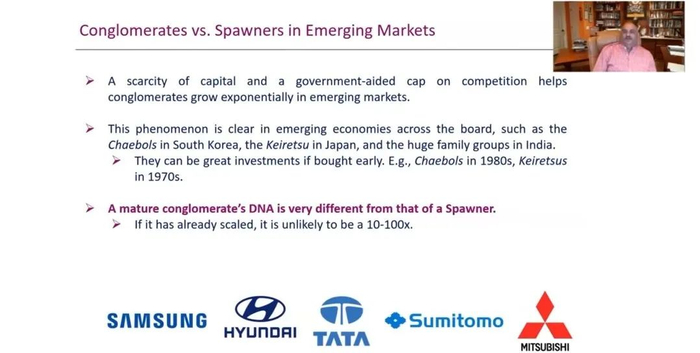 这一次,他介绍了自己在疫情居家期间体认到的一个重要概念——衍生器(Spawners)。在演讲中,他结合众多企业实例,介绍了什么是衍生器、非衍生器、衍生增值的规则、虚假衍生器和失效衍生器等要点,探讨了日韩大企业集团与衍生器之间的关系,以及根据这个概念进行投资的若干技巧。