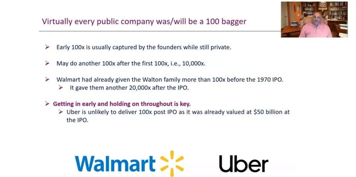 所以你看看所有上市公司,几乎全世界的大多数上市公司在某些时候都有过100倍市值,但大多数100倍股通常在它们还是私有的时候就被买入了,所以一旦上市,它们的规模可能不够小,无法达到100倍收益。所有你越早买入这些企业,就越有可能赚到你的10倍或100倍收益。