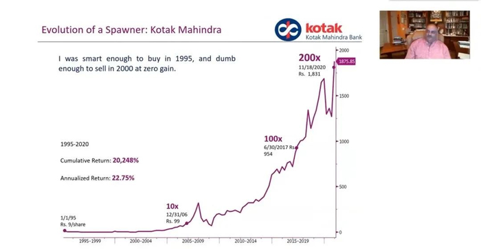 下面我想谈谈一家衍生器公司——科塔克私人银行(Kotak Mahindra )。科塔克是印度的一家公司。我很聪明,在1995年就对这家公司进行了小规模投资,但我也很笨,在2000年卖掉了这家公司,几乎没有回报。
