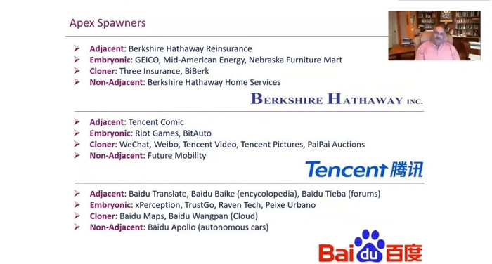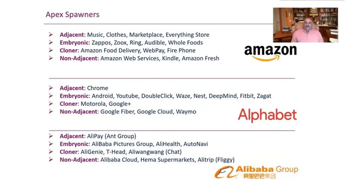 你们对阿里巴巴很熟悉,像支付宝,属于邻近衍生,但它也在萌芽衍生甚至是非邻近衍生方面做了很多业务,包括阿里云和阿里旅行。