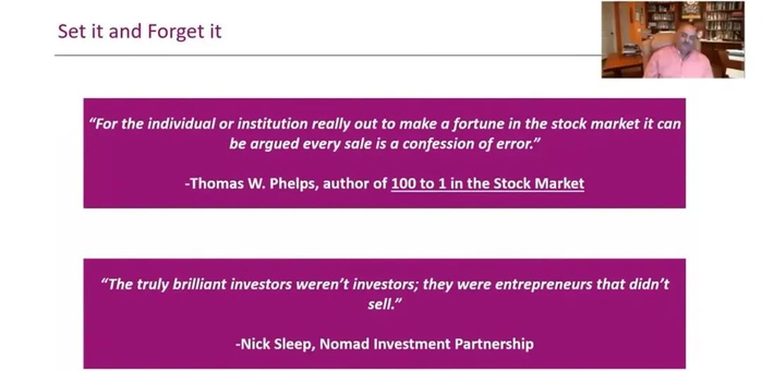 我的朋友尼克·斯利普说的一句话我很喜欢。这是几周前尼克在给我写的一封邮件中说的,他说:“真正聪明的投资者并不是投资者,他们是不愿卖出企业的企业家。“他也提到了山姆·沃尔顿。