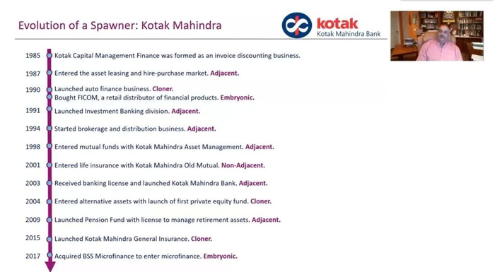 回到科塔克,它当时是非常小的经纪商。高盛在拿了它20%的股份,我猜是因为像我一样,高盛对它印象非常好。关键事情发生在2003年。2003年,科塔克获得了银行执照。在印度要获得银行执照真的很难,也就是说,储备银行向私人银行发放的银行执照非常少。今天,科塔克已经成为印度最大的私人银行之一。它运作得非常好,这也是它大部分上升空间的来源。该公司已经形成了许多相邻的业务,甚至收购了一些业务,由此开始发展。