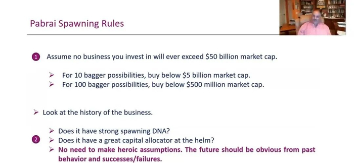 所以,目前在我的投资组合中,有三家企业是伟大的衍生器,它们都低于10亿市值。最近我又发现了第四个,它低于四亿市值,有很强的衍生增值基因,历史非常悠久,所以你可以很容易知道这家企业发生了什么事。当然,我们也在寻找更多这样的公司。一个投资组合可能有5到10个衍生器。