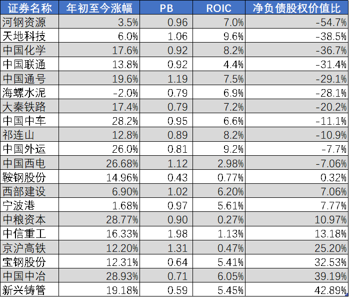 最后我们按照前文所探寻的中特估增长逻辑,寻找了目前处于估值低位的中特估样本。逻辑是年初以来涨幅未超过30%;PB倍数较低没有超过2x;投入资本回报率为正并且没有超过10%,具备资产质量优化的空间;净负债股权价值比较低,债务负担低。如下图所示。