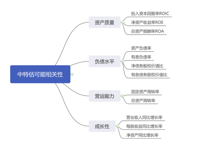 在PB相关性明确的前提下,我们从财务的各个维度来判断市场考量中特估行情的要素。因为数据量较大,我们分别选取了代表资产质量、偿债能力、营运能力和成长性的部分指标,通过SPSS软件降维因子分析试图去大范围寻找相关性。过程较为繁琐,我们简化为下图列示。