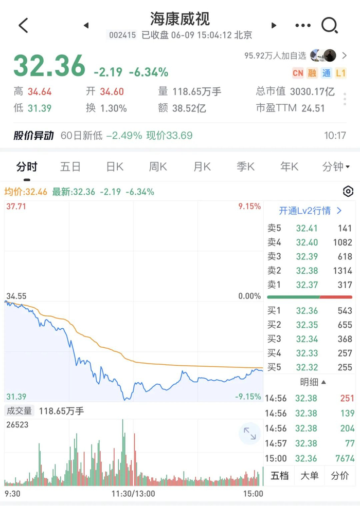 今日,海康威视盘中大幅跳水,一度跌近9%。