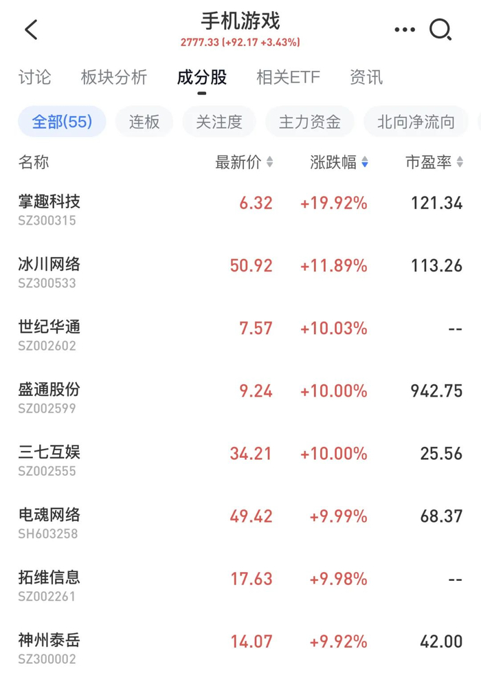 游戏股持续拉升,掌趣科技午后20cm涨停,世纪华通此前涨停,冰川网络、三七互娱、盛天网络、神州泰岳等多股涨超5%。