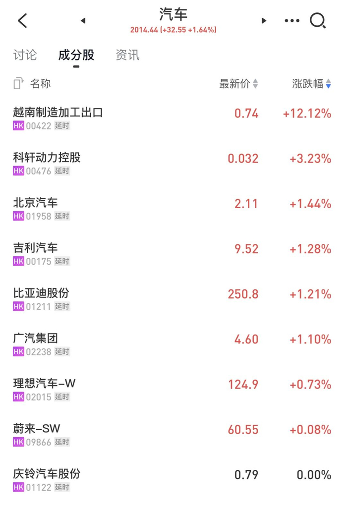 香港市场汽车股也跟随走强,恒生汽车主题指数同样高开,盘中也一度涨近2%,天瑞汽车内饰涨逾16%,平了年内最高价,这也是近15个月来的最高价;浙江世宝、五菱汽车等纷纷大幅拉升;五菱汽车涨超4%,小鹏汽车、理想汽车等跟涨。